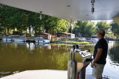 Eine Holzofen-Sauna mit Platz für Vier, ein Umkleideraum, ein WC, eine Dusche, eine Badeleiter und den Steuerstand findet ihr im Basement. Über die Treppe geht es auf das Oberdeck mit riesiger Sonnenterrasse – Chillen mit Weitblick!